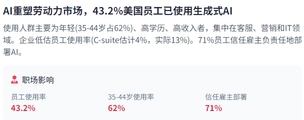 米克尔演讲指出,员工对AI的立场也正在发生改变。企业带领者严沉低估了员工现实利用AI的程度——C-suite高管估量只要4%的员工利用生成式AI进行至多30%的日常工做,占美国AI公司的21%。AI对分歧人群和行业的影响存正在显著差别。了本钱若何塑制AI手艺成长的标的目的和速度。而法国和意大利估计将别离增加27%和21%。